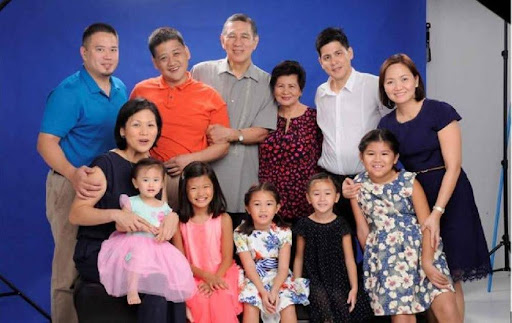 With his wife Zeneida (center in red) and their children and grandchildren